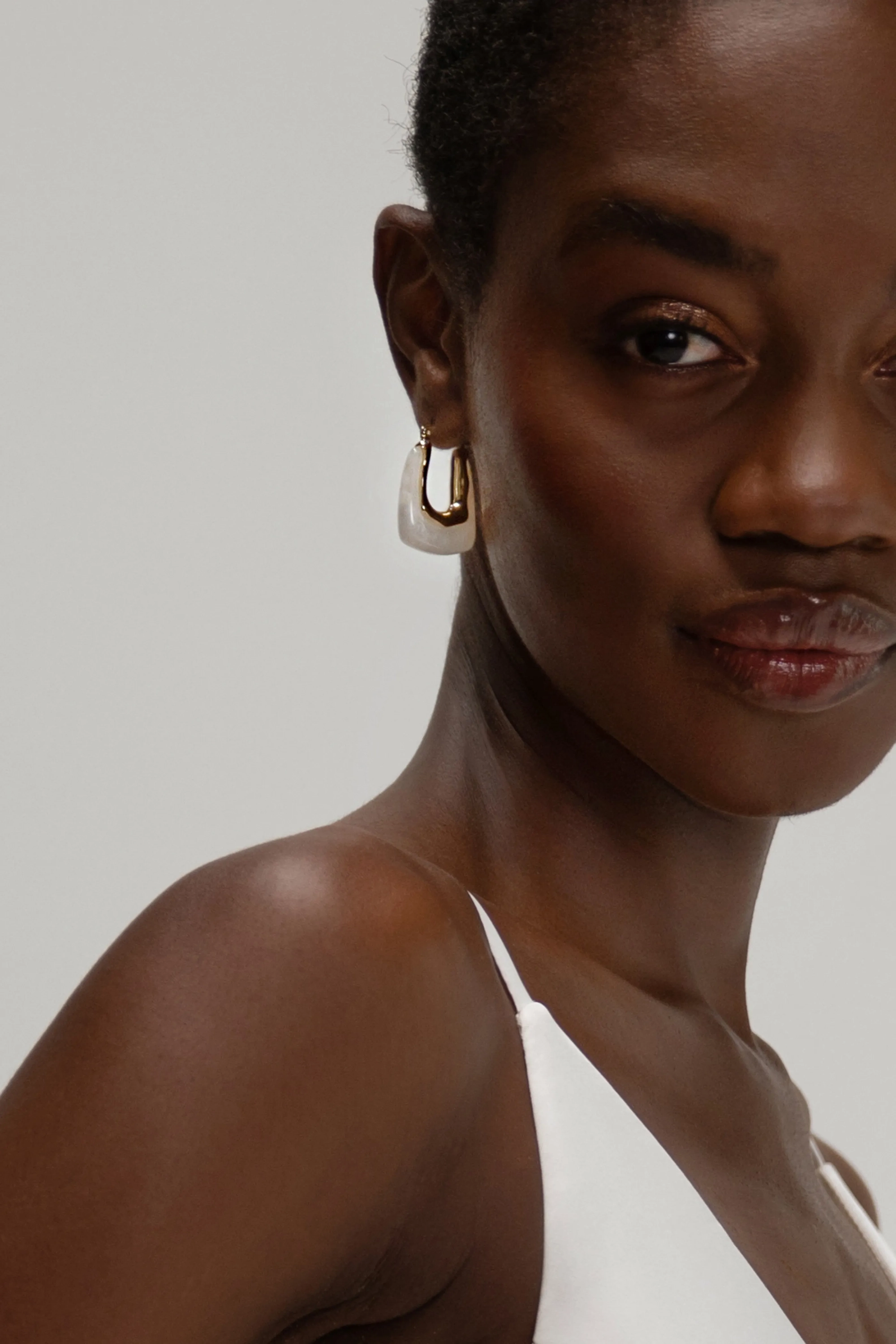 Gold and opalescent resin combine for a modern hoop that adds an understated cool to any gown.
