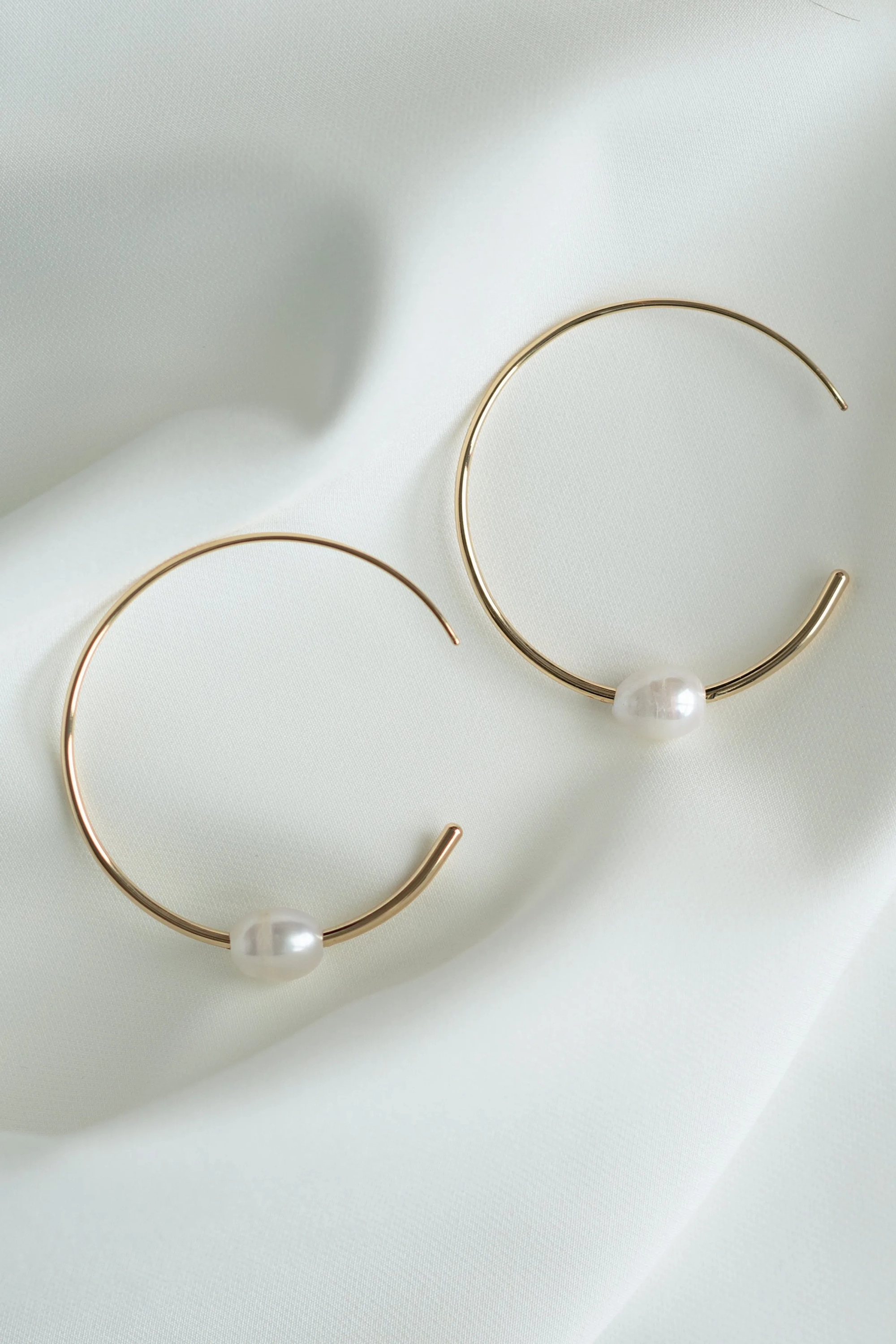 A large freshwater pearl hangs from an oversized gold hoop for a modern statement earring.