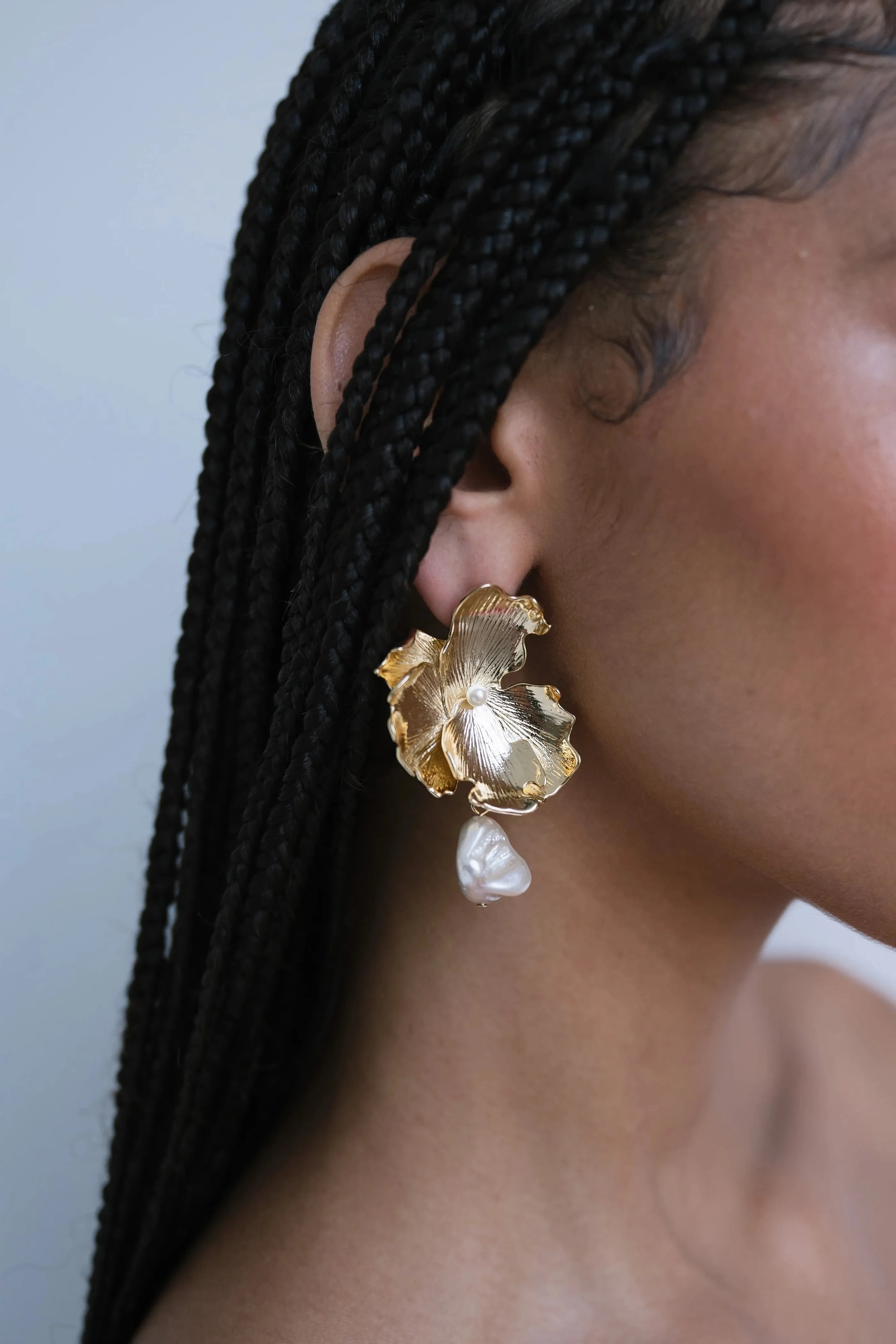 Our Selah earrings feature a glistening pearl that dangles effortlessly from an oversized brass wildflower for an organically beautiful statement.