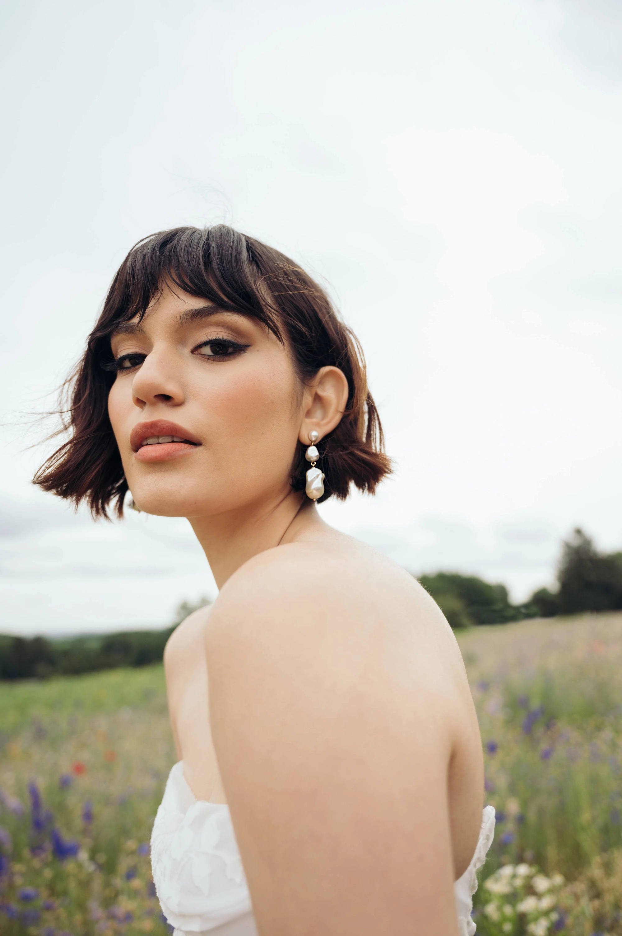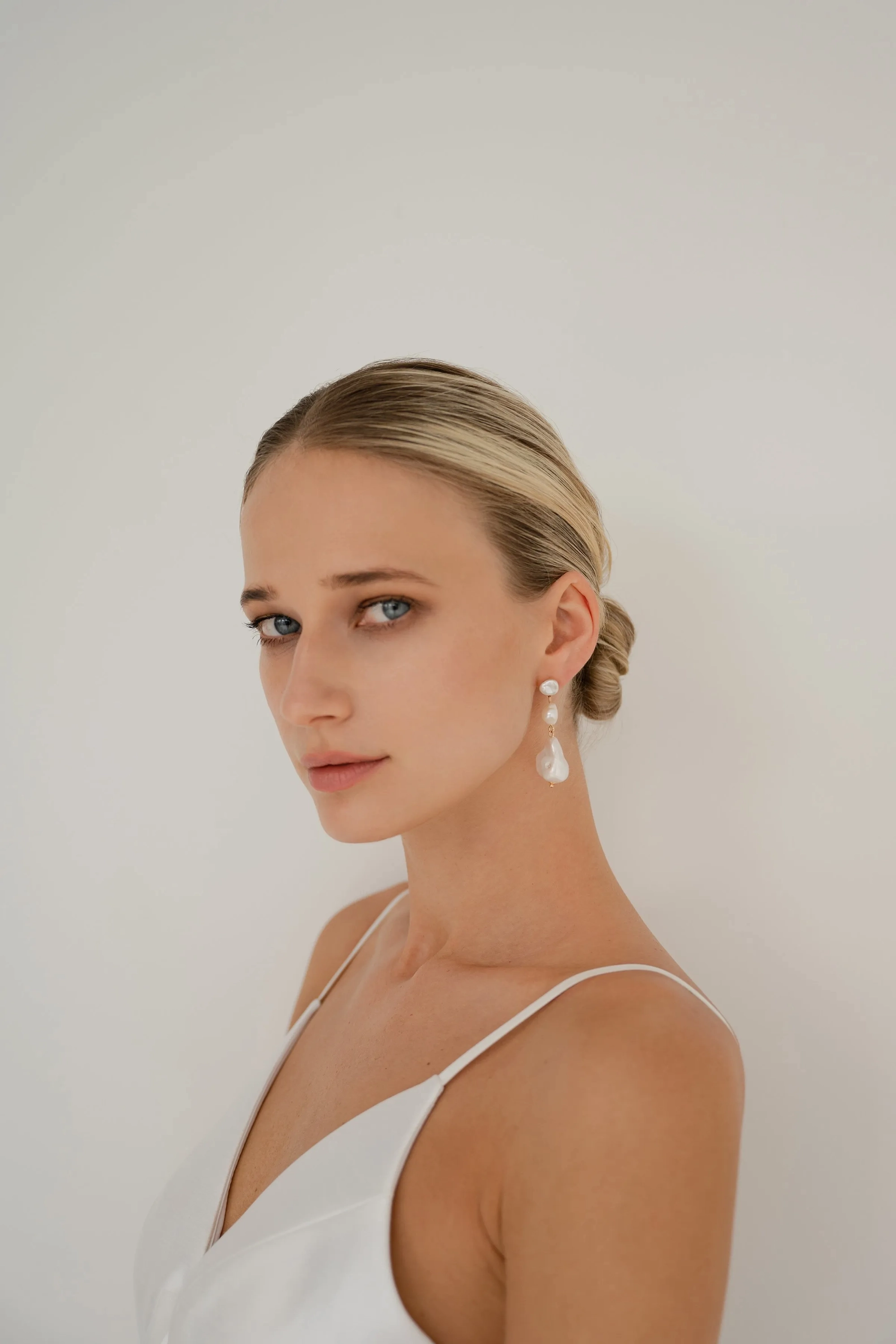 Organically shaped pearls add a bit of whimsy to a classic bridal drop earring.