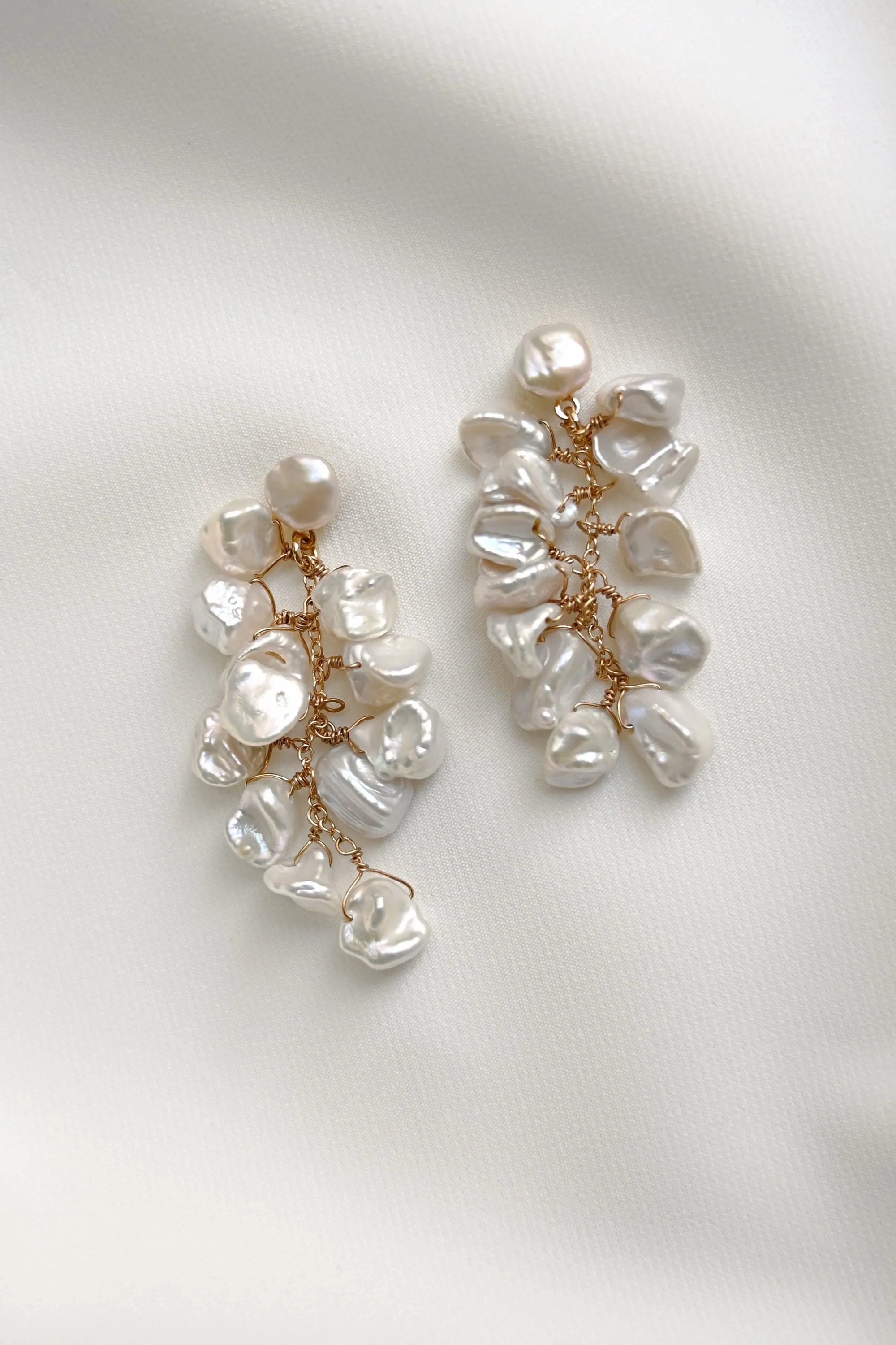 A cluster of delicate, organically shaped freshwater pearls add a romantic feel to a classic bridal statement earring.