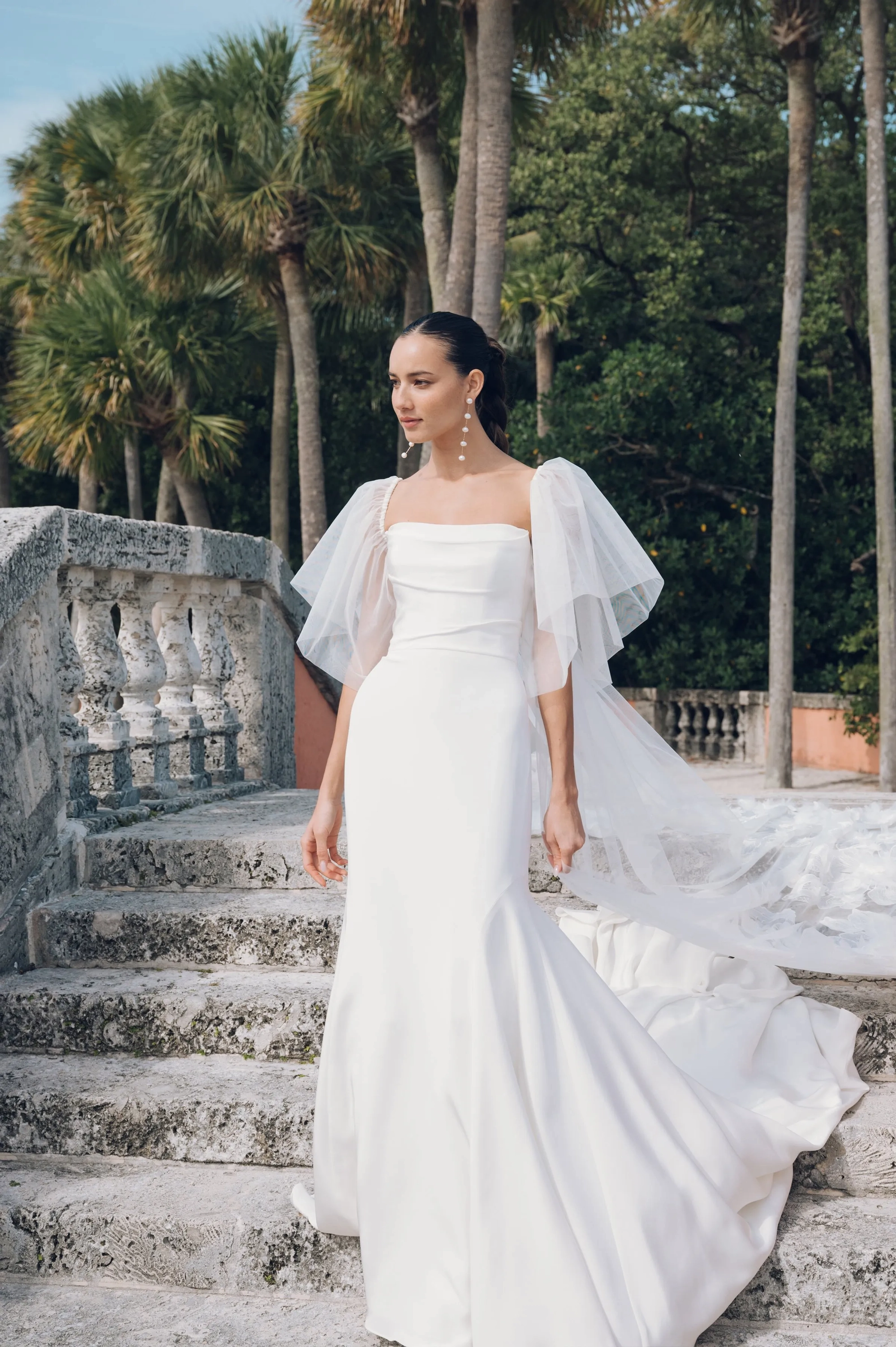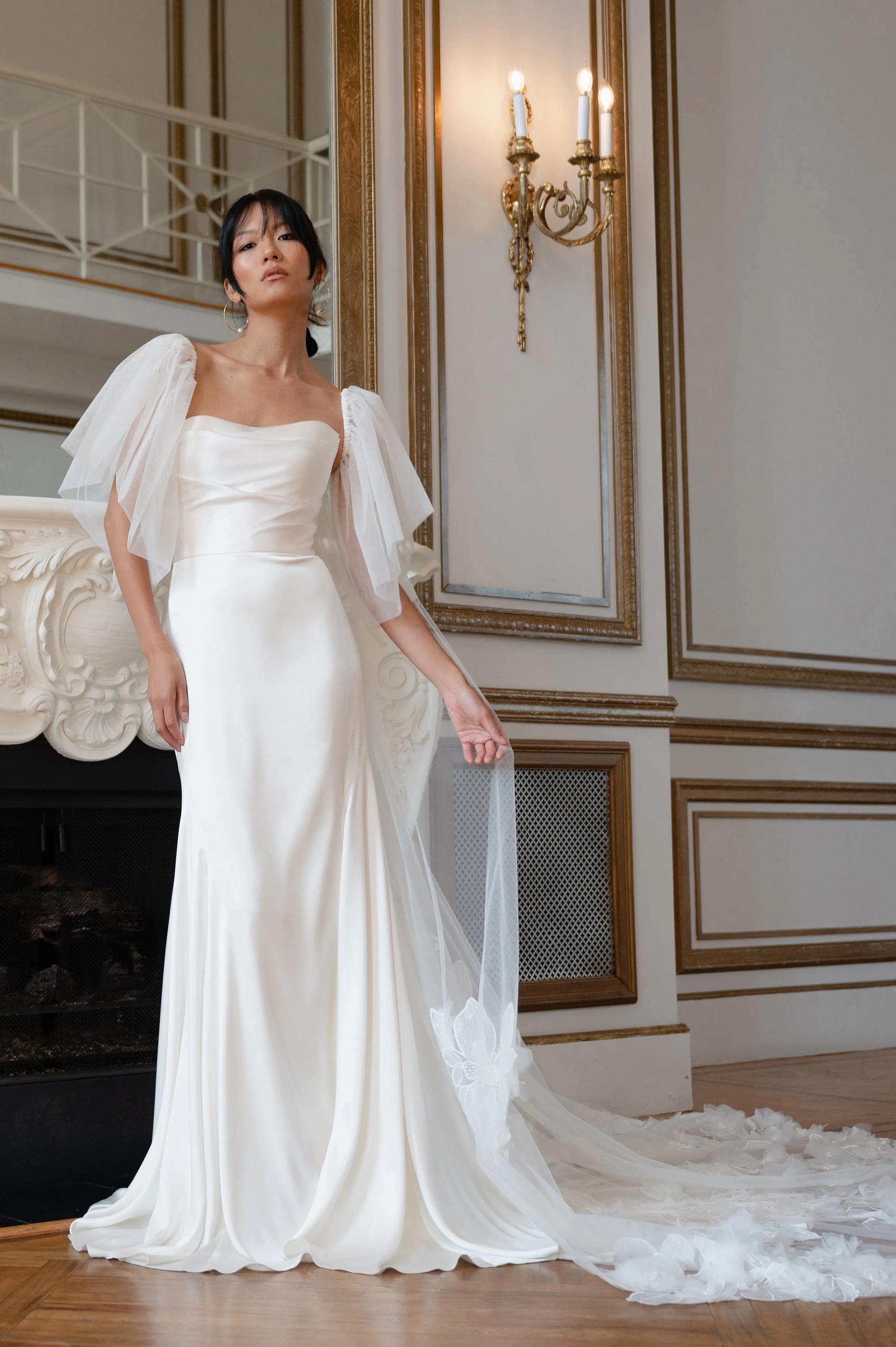 The Hayworth cape adds a glamorously feminine statement to any gown. Cut in sheer illusion bridal tulle, with our intricately detailed Bloom floral embroidery, this piece is endlessly romantic.