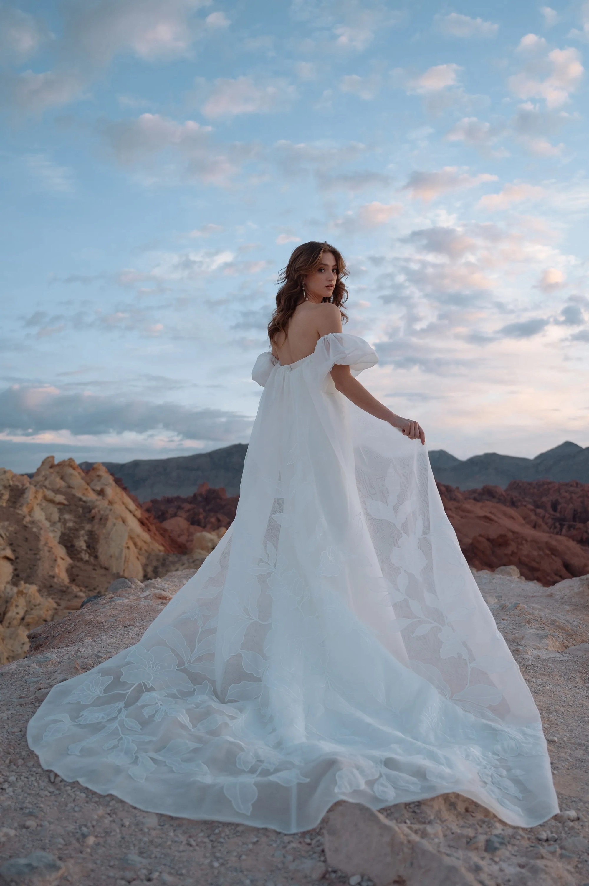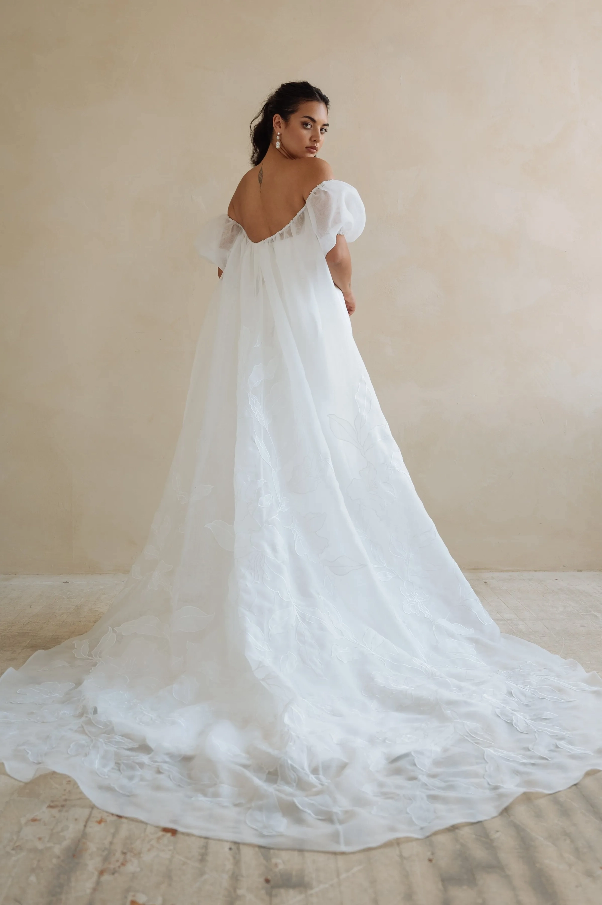 The Giselle cape, cut in sheer organza with our dramatically oversized Kacey applique, is an effortless way to elevate any gown. The puff sleeves can be worn on or off the shoulder for added versatility